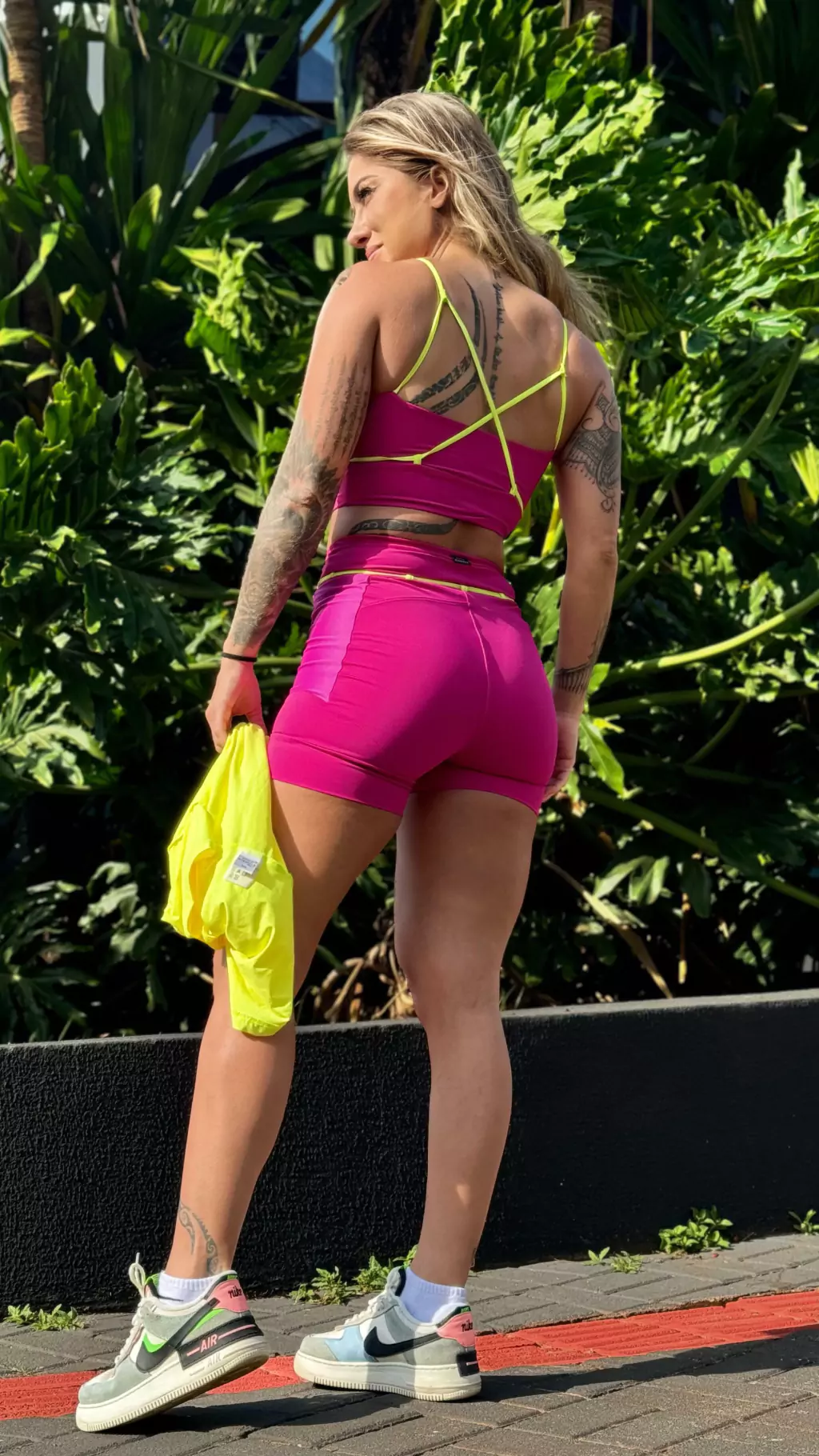 Com bolsos laterais em tecido acetinado que conferem um toque de brilho, esta bermuda é perfeita para guardar seu celular, combinando praticidade e estilo. O gancho pespontado evita que as costuras abram durante o movimento, e a barra dupla garante que a peça não suba, proporcionando total liberdade e segurança.